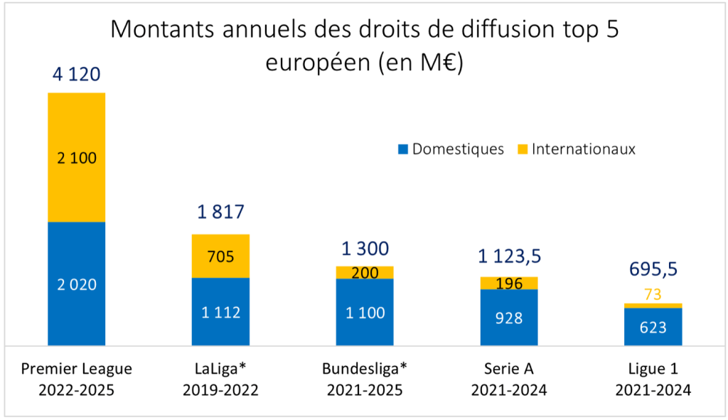 Depuis la faillite de Mediapro et la réattribution hâtive des droits TV de la Ligue 1 en 2020, Amazon, Canal + et Free sont les distributeurs officiels des championnats français. Cette attribution permet à la LFP de percevoir aujourd’hui quelque 695,5millions d’euros par saison (contre 1,153 milliards d’euro avec le contrat initial de Mediapro selon RMC Sport.