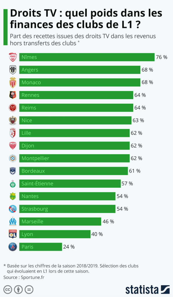 Dès lors, les clubs français deviennent de plus en plus vulnérables et dépendants des diffuseurs TV de sorte que des évènements tels que la faillite de Mediapro en 2020 pourraient mettre ces derniers dans des situations délicates voire fatales à leur survie. D’autant plus quand des crises majeures telles que la pandémie du Covid19 viennent s’ajouter à cela.