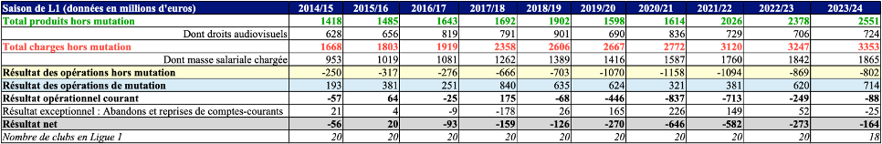 [4]Source : rapports annuels de la DNCG, situations du football professionnel français saisons 2014/2015 à 2023/2024.