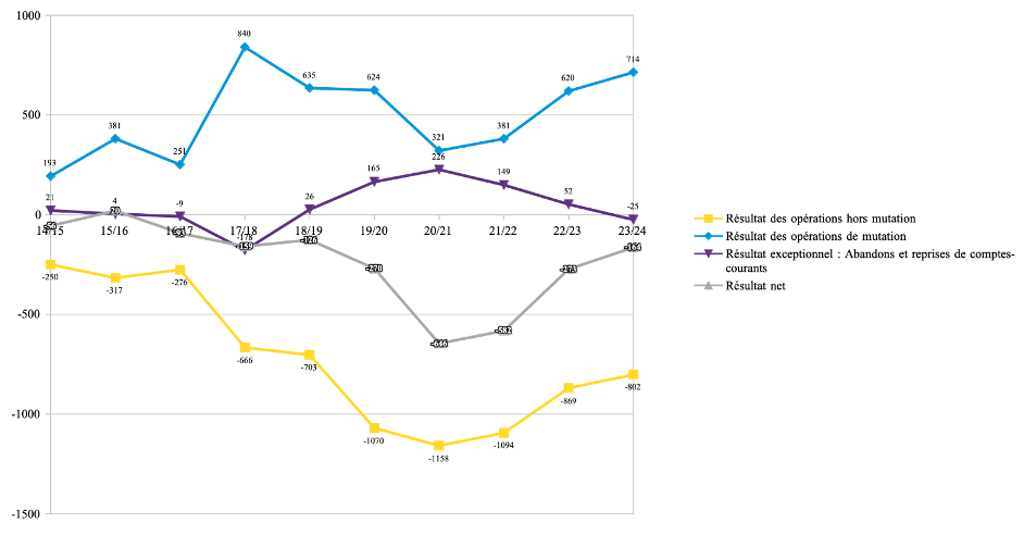 Évolution du résultat des opérations hors mutation, du résultat des opérations de mutation, du résultat exceptionnel lié aux abandons et reprises de comptes-courants, et du résultat net (en millions d'euros) :
