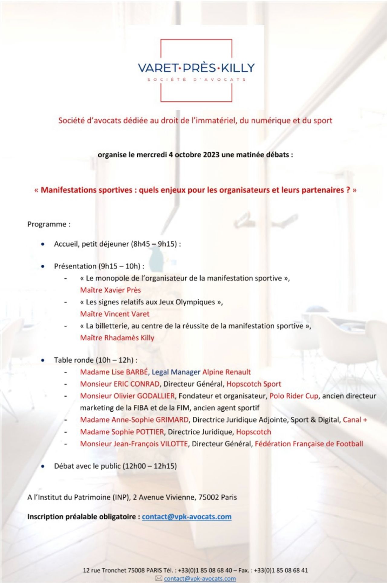 VARET PRES KILLY société d'avocats organise une matinée débat sur les « Manifestations sportives : quels enjeux pour les organisateurs et leurs partenaires ? », le 4 octobre 2023, à l’Institut du Patrimoine (INP), 2 Avenue Vivienne, 75002 Paris. À vos calendriers!