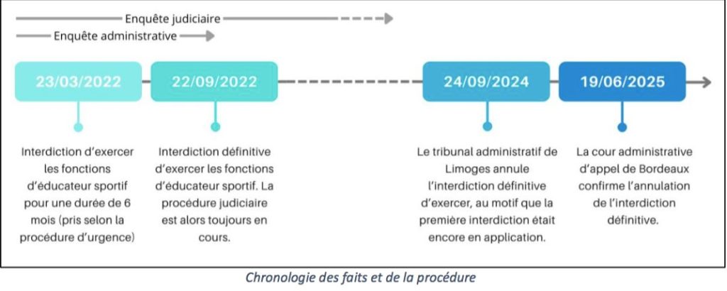 Le 22 septembre 2022, au regard des éléments résultant de l’enquête administrative, et après avoir recueilli l'avis obligatoire de la formation spécialisée du conseil départemental de la jeunesse, des sports et de la vie associative, la préfète de la Haute-Vienne prononce à l’encontre de l’éducateur une interdiction définitive d’exercer les fonctions d’éducateur et de juge-arbitre.